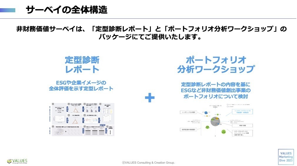 一つは企業の現在のESGの取り組みの立ち位置を明らかにしていく「定型診断レポート」。もう一つは「定型診断レポート」の結果を元に企業の今後のアクションを議論する「ポートフォリオ分析ワークショップ」の2つで構成されています。