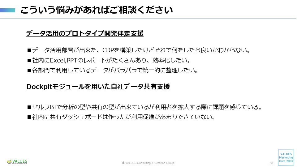 和田:こうした浸透・拡大フェーズにおける課題に対してヴァリューズが提供できるソリューションとして、Dockpitの仕組みを活かした自社データを可視化できるツールをご紹介します。