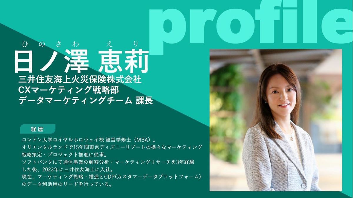 三井住友海上火災保険株式会社 日ノ澤 恵莉氏(以下、日ノ澤):社内のCX支援でも、営業からマーケティングに関する困りごとを受けて、データで課題解決の支援をしています。