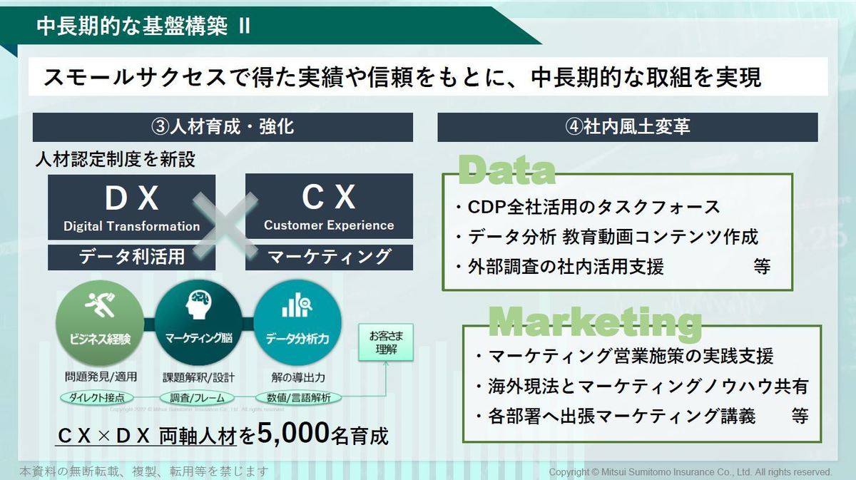 ビジネス経験、データ分析力に加えてマーケティング脳、この3つを兼ね備えた人材を大量に育成しています。2年半前から現在まで千数百名まで拡大しました。更に中長期的にはこのCX×DXの人材を5,000名以上に増やすところまで計画しています。こうなると社員全体の数%を占めるので、マーケティングやデータ分析が共通言語になる。これが大きな事なんです。