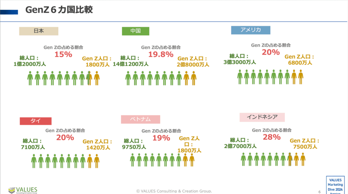 本セッションでは、日本、中国、アメリカ、東南アジアの計6カ国のGen Zが比較されました。まず、これら6カ国の総人口に占めるGen Zの割合はどうなっているのでしょうか。