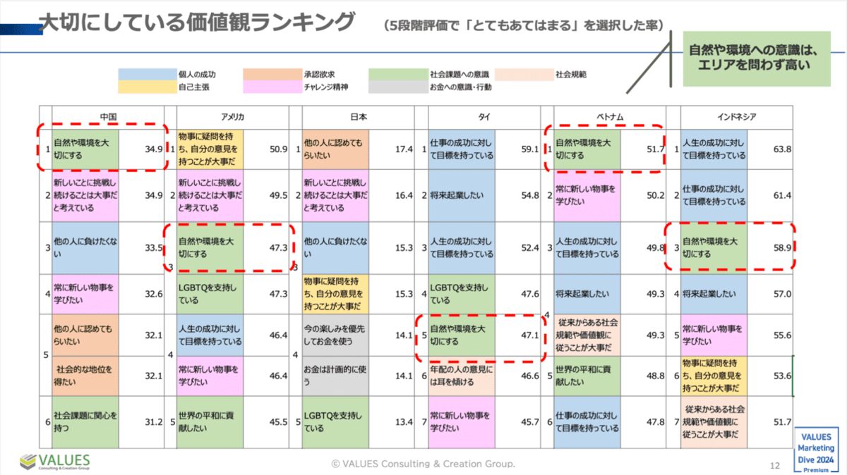 すべての国で「社会問題への意識」を指す緑色の項目がランクインしていることがわかります。特に、「自然や環境を大切にする」という項目がほぼ全ての国でランクインしていることから、自然や環境への意識はエリアを問わず高いと言えます。