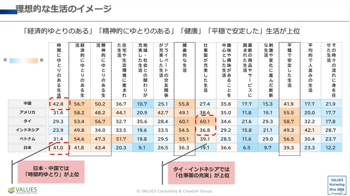 また、右側の東南アジア3カ国(タイ、ベトナム、インドネシア)では、青色の項目が目立ちます。これらは「個人の成功」に分類される価値観であり、アグレッシブでハングリーなワードが上位にランクインしている点が東南アジアの特徴です。