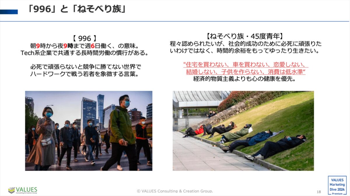 また、中国では近年「996」や「ねそべり族」のような言葉も流行しています。このような言葉の流行やデータ全体から、日中の若者には世の中に対する諦観が見られるのではないでしょうか。