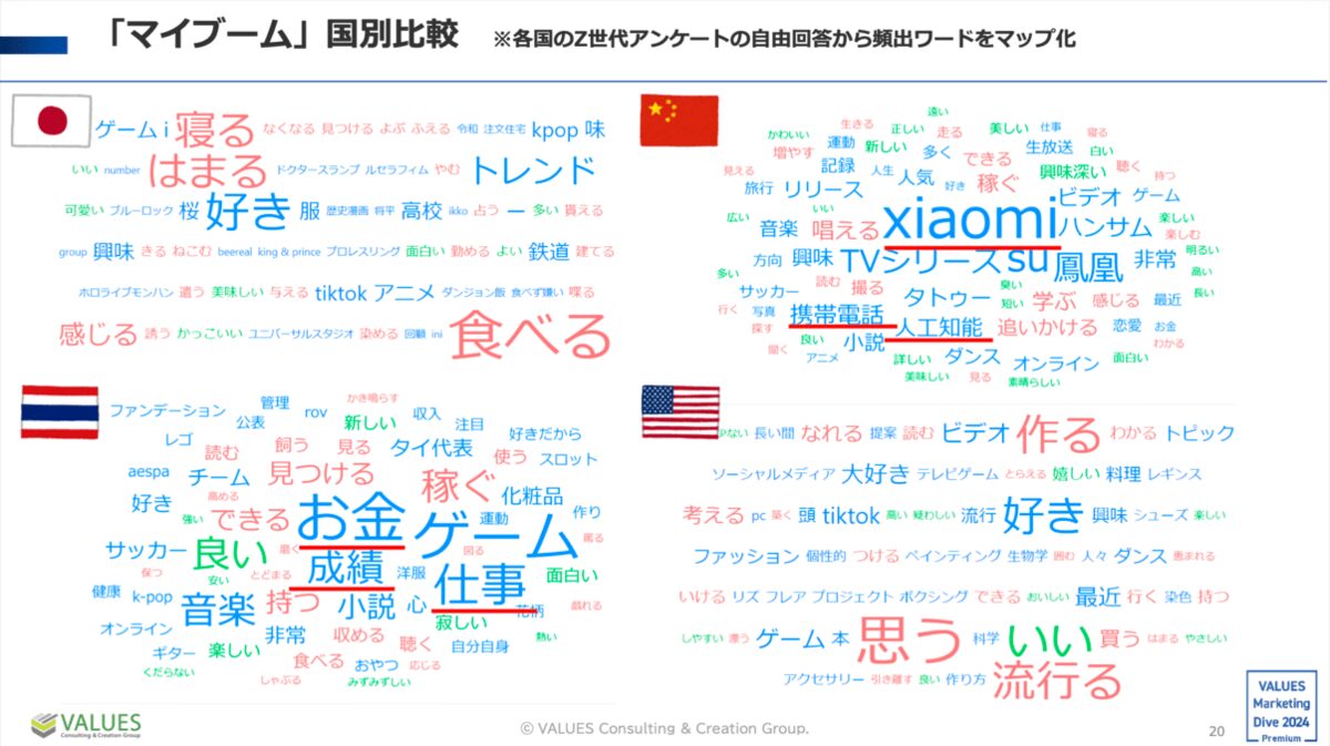 これを見ると、タイの若者は勉強やキャリアアップに関する発言が相対的に多いようです。 中国の若者には、テクニカルなこと、テクノロジー、新しい技術のようなことに興味を持つ人が多く見られます。一方で、日本ではキャリアアップやテクノロジーに関する発言はあまりなく、エンタメまたは自分の趣味をマイブームとする人が多いようです。