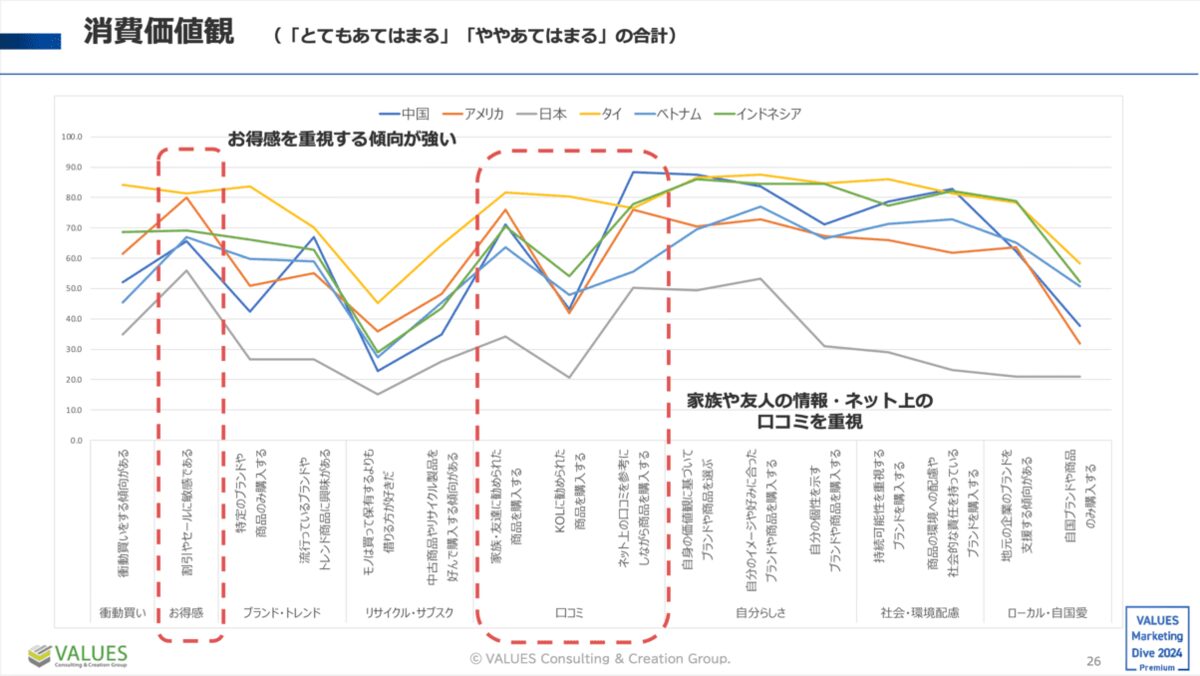 このグラフの点線で囲われている部分から、「お得感」「家族や友人の情報・ネット上の口コミ」を重視する傾向があることがわかります。また、グラフの右側の項目である「社会・環境に配慮された商品」「自分らしさを示せる商品」に関しても購入意欲が高く、「地元の企業のブランドを応援したい」という意向が強いことも読み取れます。