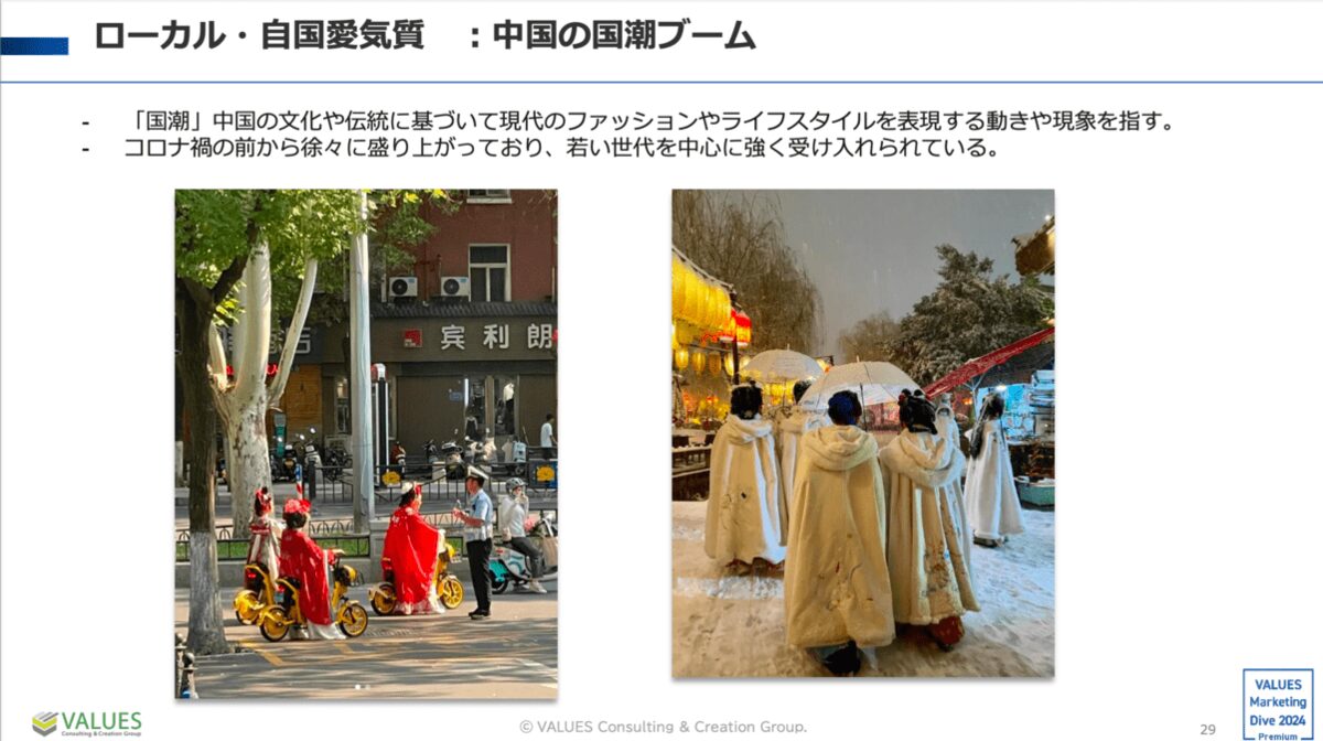 「ローカル・自国愛気質」もGen Zの消費行動を紐解くキーワードです。中国では、「国潮」が長らくブームになっています。「国潮」は「自国愛」のようなイメージで、中国文化や伝統に基づくものを魅力的だと感じ、それを自分でも取り入れたいというような風潮です。以下の写真は、中国の観光地で、中国の若者が地元の伝統衣装を着て写真を撮ることや散策を楽しんでいる様子です。このように、あえて自国の文化に深く触れてみることが魅力的・楽しいと思われているようです。