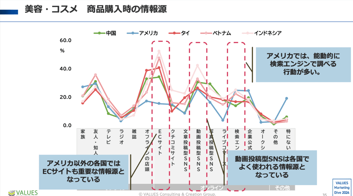 では、各国のGen Zはどのように情報収集を行っているのでしょうか。今回は美容・コスメの商品を購入する際の情報源についてのアンケートから分析します。以下の図がアンケート結果のグラフです。