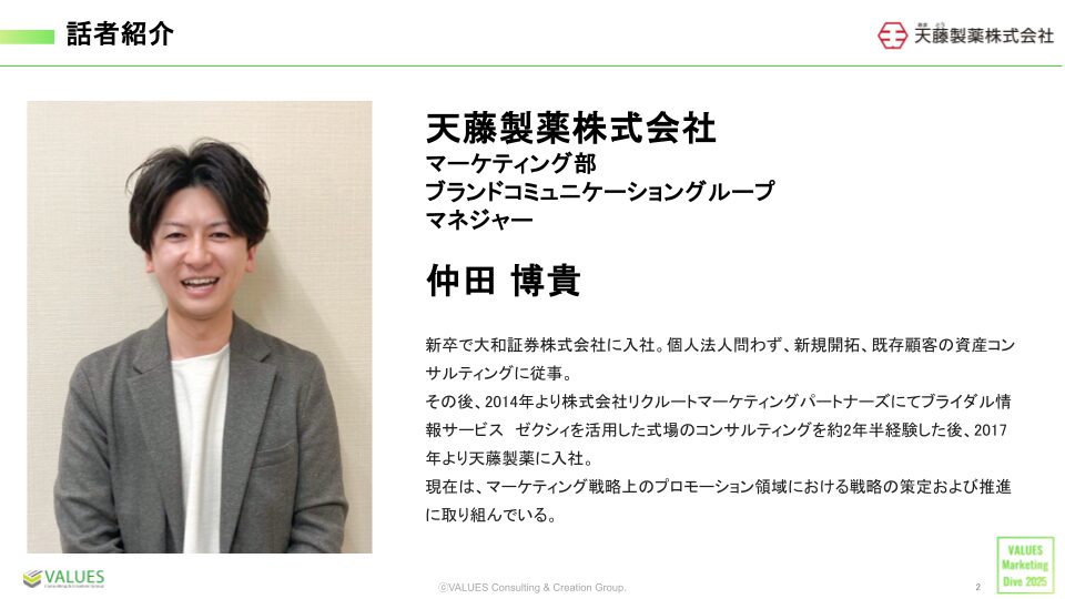 天藤製薬株式会社 仲田博貴氏(以下、仲田):弊社は痔の薬「ボラギノール」を製造販売している創業104年目の会社です。「安らぎと感動を提供する」ことをミッションとして、常に生活者様の期待を超えることを目指して活動を行っています。