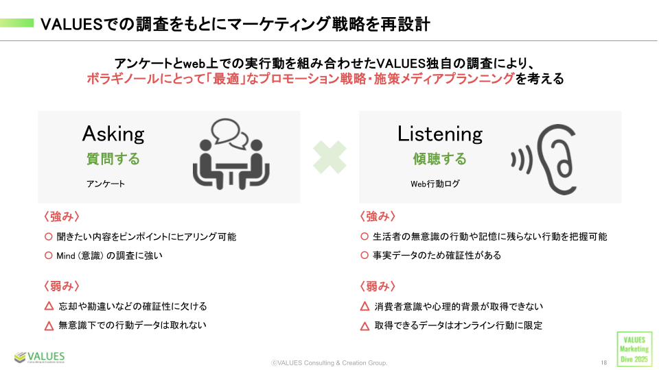 小幡:ヴァリューズでまず取り組んだことは、実際のターゲットがどんな行動をしているのかの調査と 、実行動に基づいたカスタマージャーニーの作成です。アンケート調査とWebの閲覧履歴データの2つをシングルソースで紐づけた、 調査パネルを活かしました。