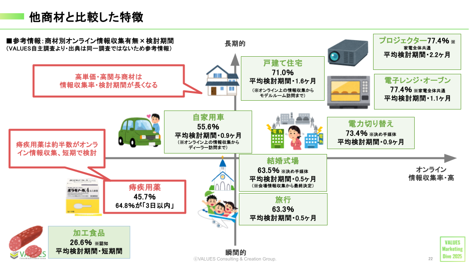 以下は他商材と比較したグラフです。縦軸は情報収集が長期的か瞬間的か、横軸はオンラインでの情報収集率を表しています。右上の象限が非常に多く、左下の象限にプロットされる商材は非常に少ないのですが、痔疾用薬はまさに左下にプロットされる商材でした。