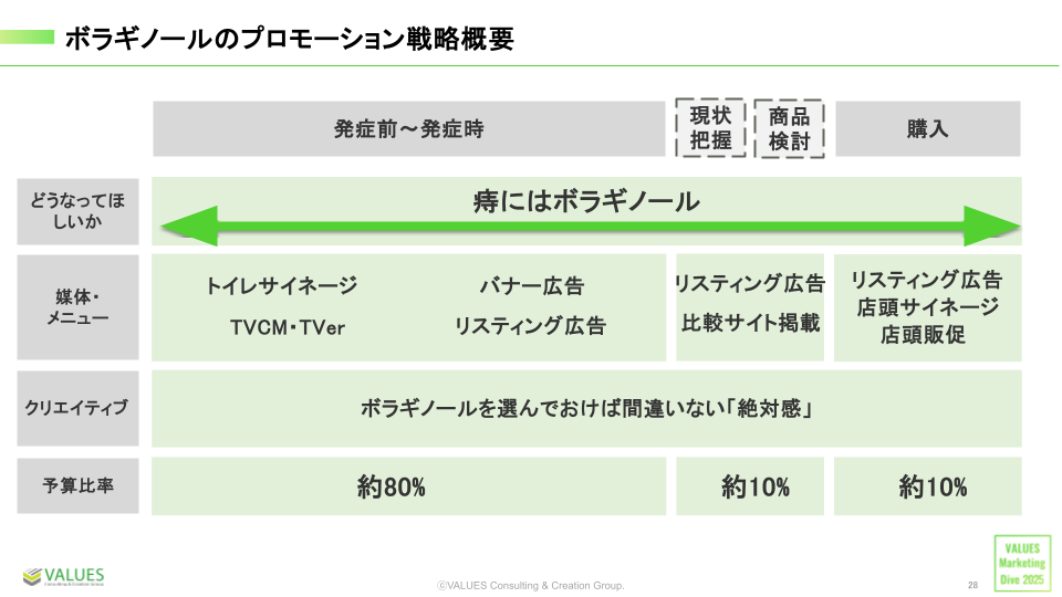 プロモーション戦略では、すべてのファネルを通して「痔にはボラギノールを選べば間違いない」というマインドの醸成を目的としました。媒体、クリエイティブ、予算の面から戦略立案および施策を実行し、分かりやすいところでは、予算の80%を発症前・発症時のファネルにつぎ込んでいます。