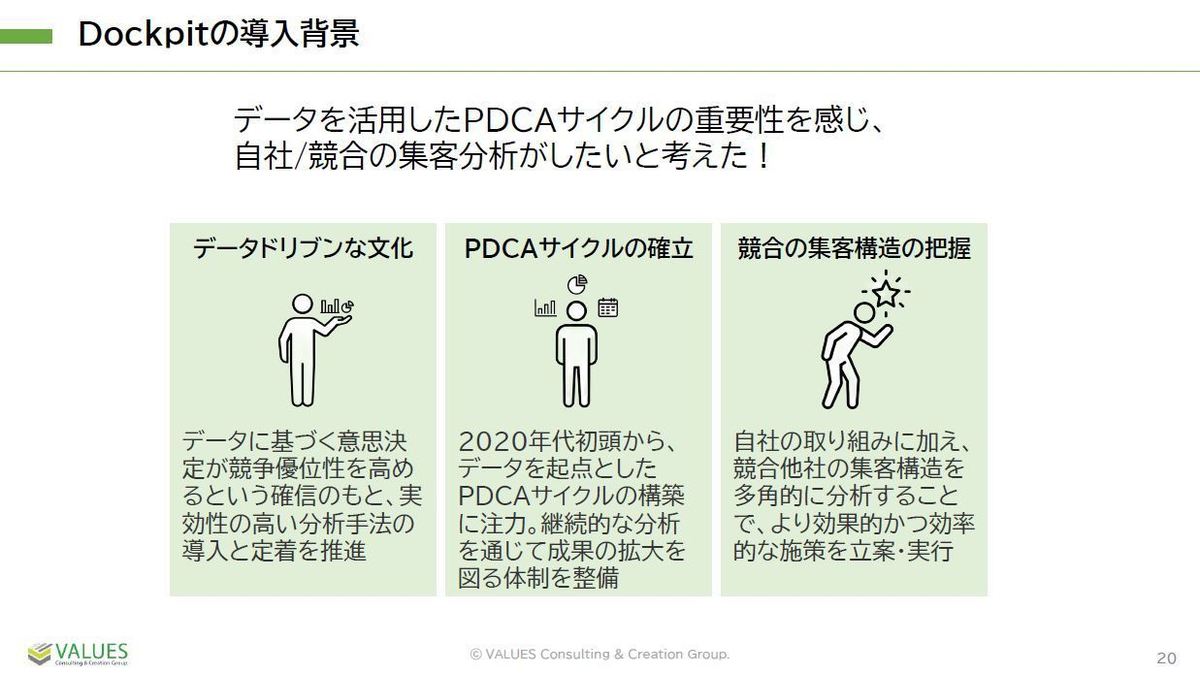 競合他社も同じように伸びているのか、あるいは自社だけが落ちているのか。そこが分からなければ適切な打ち手は打てません。他社比較の重要性を痛感し、Dockpitの導入を決めました。主な目的は以下の3点です。
